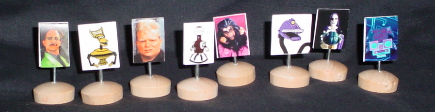 I included a whole set of these cards too. Plus cards for SHORTS and INVENTIONS, which would take the place of "Chance" and "Community Chest" from the original Monopoly game. You keep saying you "included" things in your game? Where are they? For that matter, where is any of it? A-ha! the all important question. "How do I get this wondrous game?" Right now the game (except for my copy) is a series of 1's and 0's inside a server somewhere south of Oshkosh. It is composed of 7 files. Five of them are .pdf files. They contain: (1) the film Deeds (double sided color) (2&3) the Cards (double sided B/W) (4) the Game Pieces (single sided color) (5) The Stars and Awards (single sided color) File six is an .rtf of the MST-opoly rules. The seventh file is the gameboard. It is in Adobe Photoshop format. It is a very large file for a very large board. (27"x27") The file is about 14 Mb in size. Or for you do-it-yourselfers, there are eight board segments (.pdf again) you can print out instead and assemble at your leisure. So I download these files. And then what? Then you print them out. You can either use your own printer for free, or take it to a print shop and have them do it on fancy heavy paper for a little bit more money than free. I took these files to Quik Print and had the cards and deeds and stars and tokens printed on card stock. The board I splurged on and had it made of the indoor banner material. PRICEY! But you can use the "Cut Board" files and print them on LEGAL sized paper or cardstock for a lot less. What's the deal with the page full of game pieces? Cut along the outlines of each piece. Fold along the dotted line in the middle. They make nice little tents you can walk around the board. Or glue the backs of the pics together with a toothpick or something similar sticking out of the bottom. Then stick the toothpick or eye-screw in a wooden or styrafoam base of your own choosing. (I bought mine at Michaels Hobby store - 99¢ for 6). Paint the bases if you feel like. Wow, you sure have gone through a lot of trouble. Yeah, I suppose so. Why did you do it? Like so many of my projects over the years. It starts with a "wouldn't it be neat if". That idea usually sits unattended for several months to several years, and then a sudden burst of energy will come from nowhere and compel me to make it happen. Why do I do it? Because I can - because I want to - and because noone else will. And I get all this. All the fruits of your labor. For nothing?