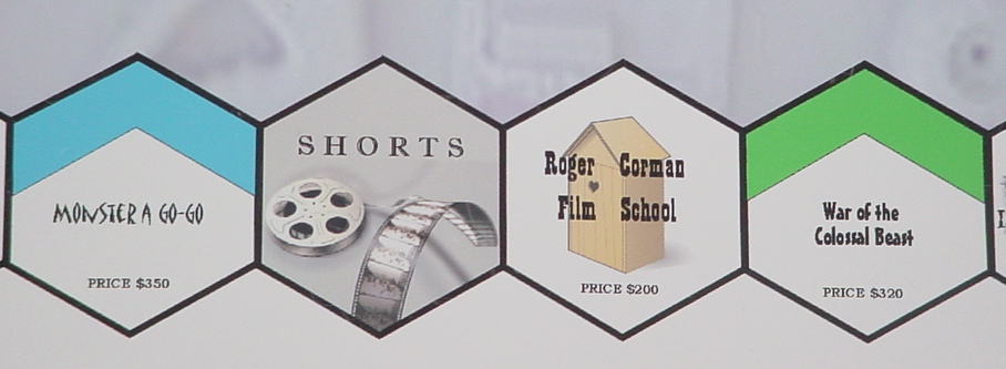 Let's go through some of the WITWBFAQ* shall we? How does it feel to be so clever and creative? Well, mom, you and dad had a lot to do with that, of course. Oh look, some other, actually relevant questions. "-opoly" ? So it is just like Monopoly? No. Not just like. I use z-grade movies instead of properties, and film schools instead of railroads and hexes instead of rectangles for board spaces... and so on. But the basic game mechanics are based pretty firmly on Monopoly rules. So the object of the game is...? TO RULE THE WORLD! Or at least television cable movie channel portion of it anyway. But how? You win by buying as many really bad movies as you can. And then showing them over and over and over and over and... you know, just like real life cable movie channels. Other cable station owners (the other players) will periodically need filler for their own budding networks and ask to borrow (land on) one of your cinematic properties. Then you get to charge them. What about houses and hotels? Obviously you can't put a house on an original print of Mighty Jack... as much as we all might want to. But you can "pay" a movie reviewer to give your movies STARS. Up to four stars to be exact, which would be up to four more than most of these are worth. And then when your movie gets enough stars, you can pony up some more cash to rig an AWARD show to give your prize pile of celuloid the honor some other film so richly deserved. What about tokens? Can I be the Iron? Sure, if you want. I recomend something a little grander. But I also include with the game a collection of counters based on the characters of Mystery Science Theater 3000. (Some Assembly required) And property deeds?